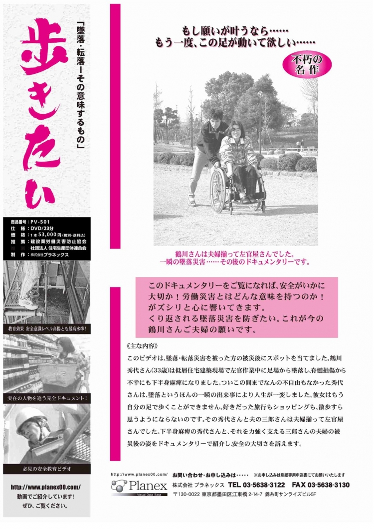 夫婦揃って左官屋さんでした。下半身麻痺の妻とそれを力強く支える夫の、夫婦の被災後の姿をドキュメンタリーで紹介し安全の大切さを訴えます。