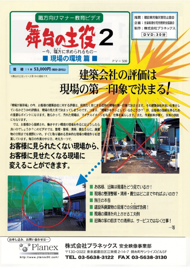 この映像教材はドラマを通して、現場の整理・整頓・清掃や養生、近隣の家の前までの清掃など、どのようにすれば信頼を得られるのか、よくわかります。