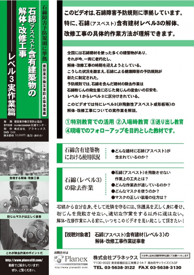 この視聴覚教材では特にレベル3(非飛散性アスベスト成型版等)の解体・改修工事についての作業を解説しています。
