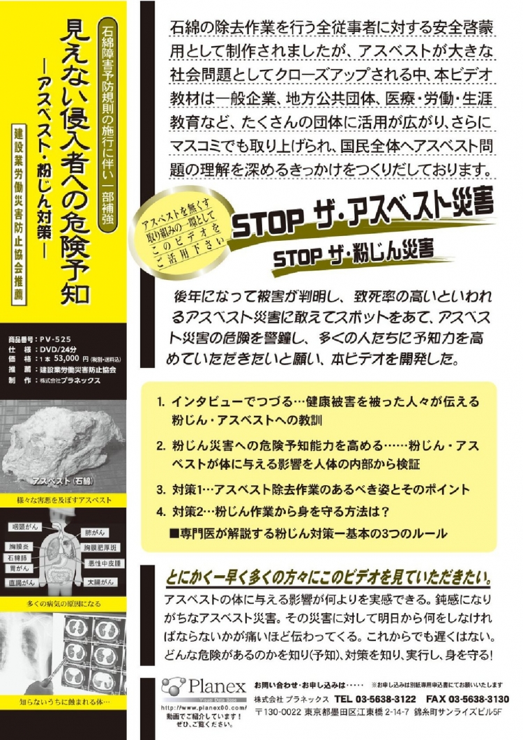 続いて粉じん・アスベストが身体に与える影響を専門医が検証し、除去作業のあるべき姿と、粉じんから身を守る方法を解説しています。