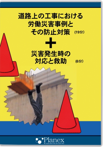 実際の国道・工事現場で日常的に使っている高所作業車・タイヤローラー・クレーン車と、ダミー人形を使って道路上の工事における代表的災害事例と対策を6事例を再現します。