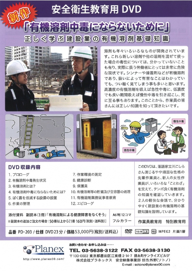 このDVDは、落語家立川こしらさん演じるやや頑固な性格の先輩作業員と、新人の女性作業員が、いろいろな「ことわざ」を交えて、テンポ良く有機溶剤の知識を確認していきます。