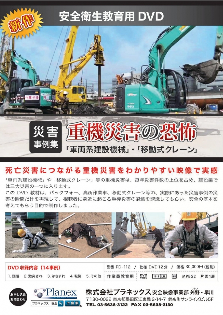 このDVD教材は、バックホウ、高所作業車、移動式クレーン等の、実際にあった災害事例の災害の瞬間だけを再現して、視聴者に身近に起こる重機災害を認識してもらい、安全の基本を考えてもらう目的で制作しました。
